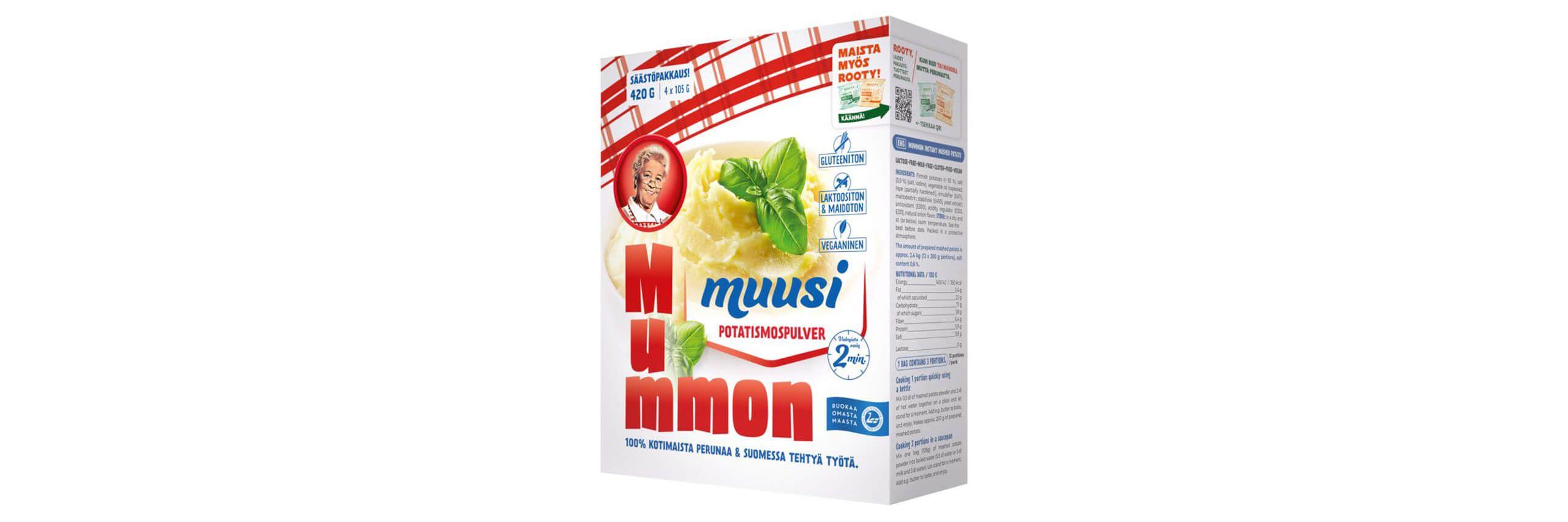 Herkullista muusia vaivattomasti kahdessa minuutissa! Mummon muusi on valmistettu suomalaisesta perunasta, tuote on monikäyttöinen ja helppo tapa valmistaa herkullisia perunaruokia. Perunamuusijauhe sopii hyvin myös leivontaan. Mummon muusi on kätevä apu kiireisellekin kokille. Maistuva ja kotoisa perunamuusi valmistuu kahdessa minuutissa.